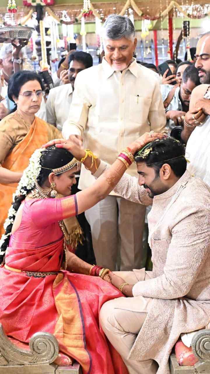 నారా చంద్రబాబునాయుడు , నారా భువనేశ్వరి , నారా లోకేష్ నూతన వధువరులను ఆశీర్వదించారు.